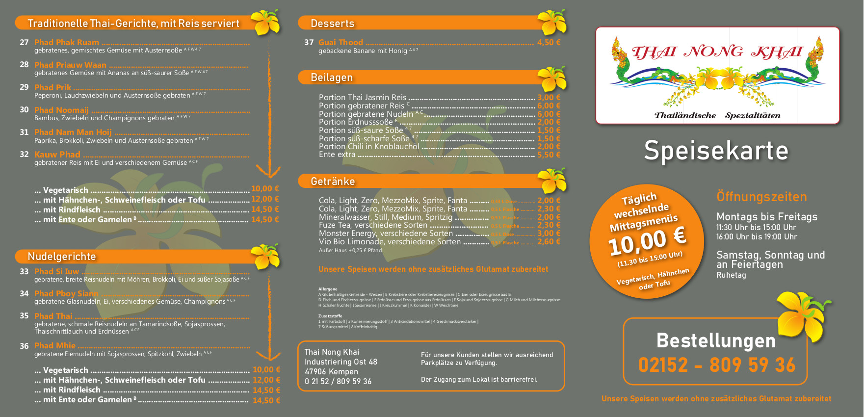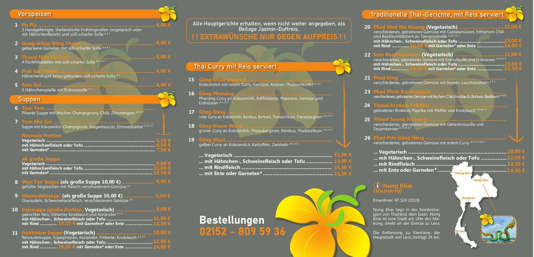 Unsere Karte bietet Ihnen eine reichhaltige Fülle köstlicher thailändischer Spezialitäten, die sie sonst nur in Thailand bekommen.
